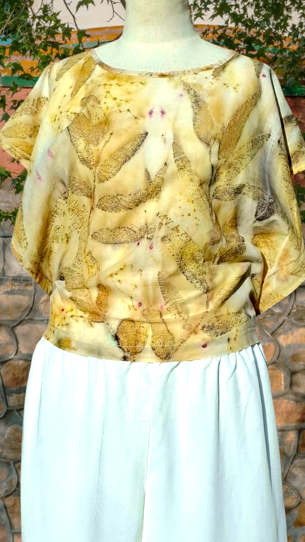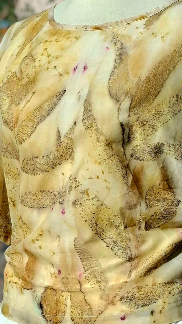 Blusa en poplin de algodón fino, intervenida con técnica de ecoprint utilizando hojas y flores autóctonas. Cada estampado es el resultado del diálogo entre la tela y la naturaleza, creando una composición orgánica y luminosa.